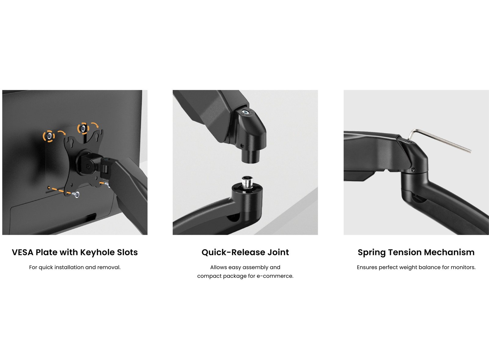 2. Gas spring perfectly counterbalances the weight of your screen to help effortless adjustment for viewing comfort.