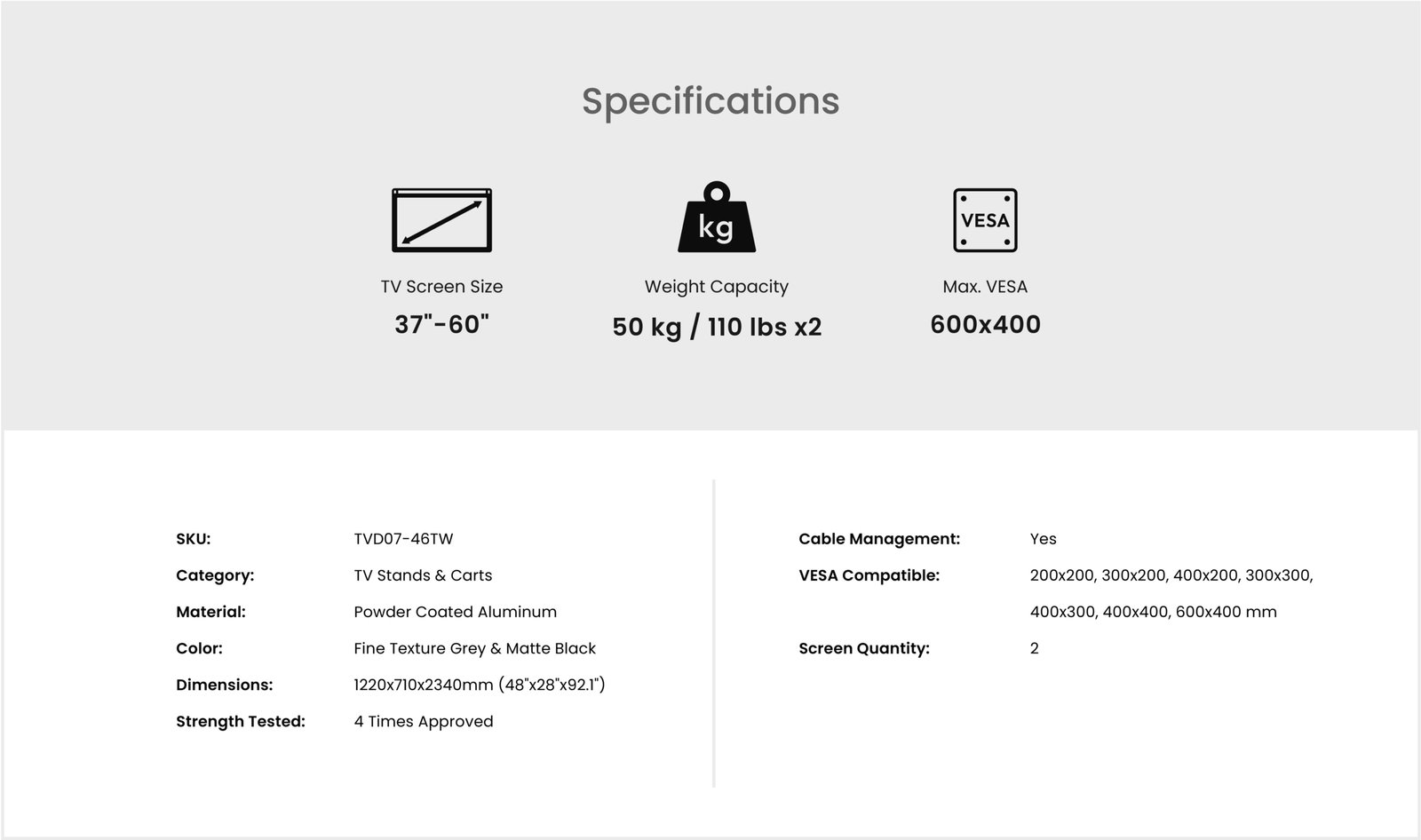 • TV Weight Capacity: 50kg x 2 (110lbs x 2)