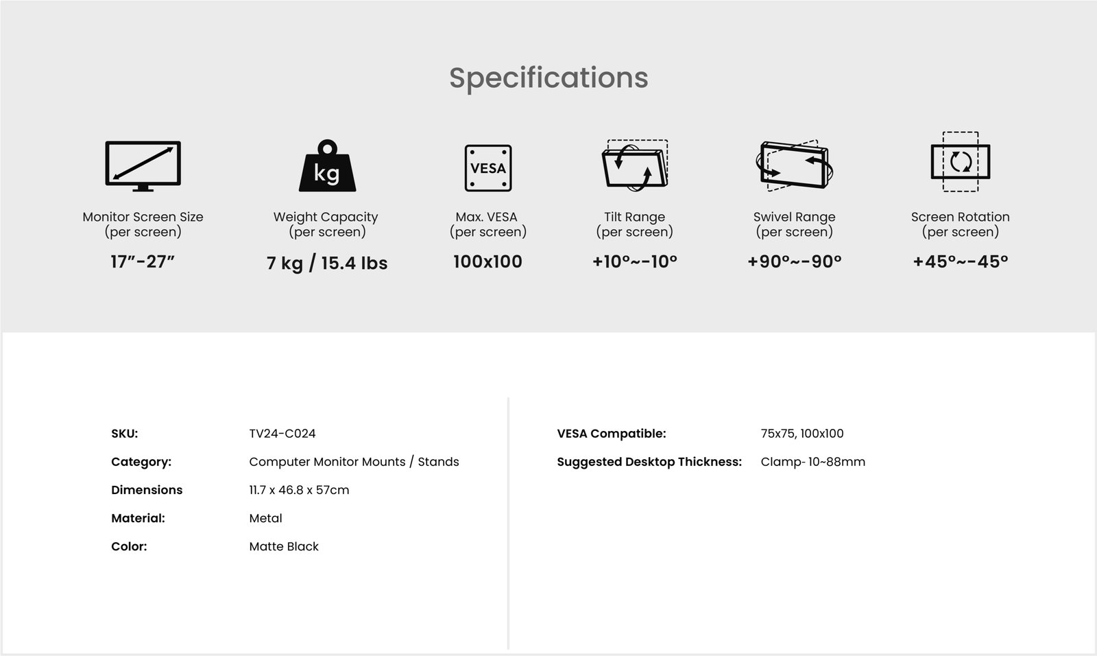 7. Max Load per monitor arm: 7 kg/15.4lbs