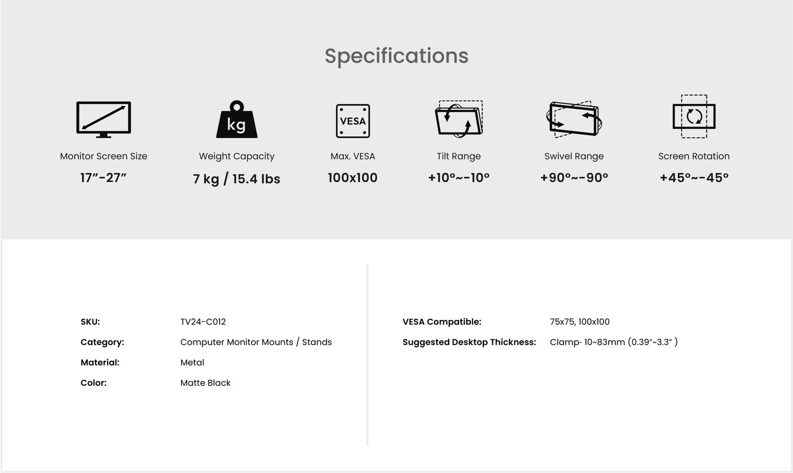 - Suggested Desktop Thickness: Clamp:10~83mm (0.39″~3.3″ )