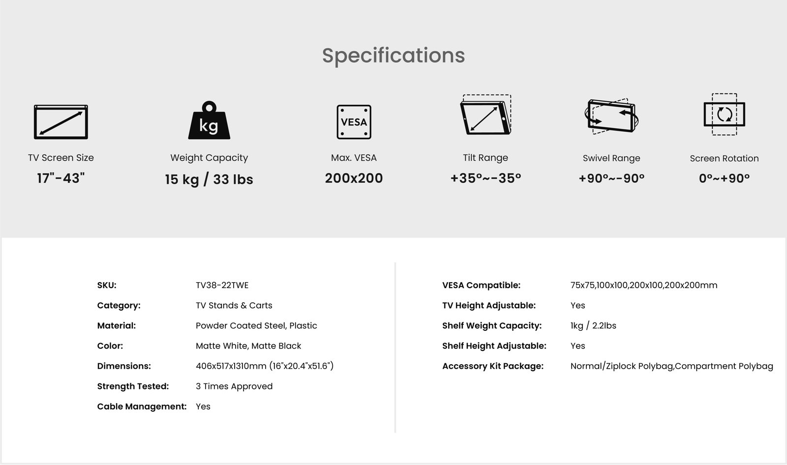 - VESA compatible: 75×75, 100×100, 200×100, 200x200mm