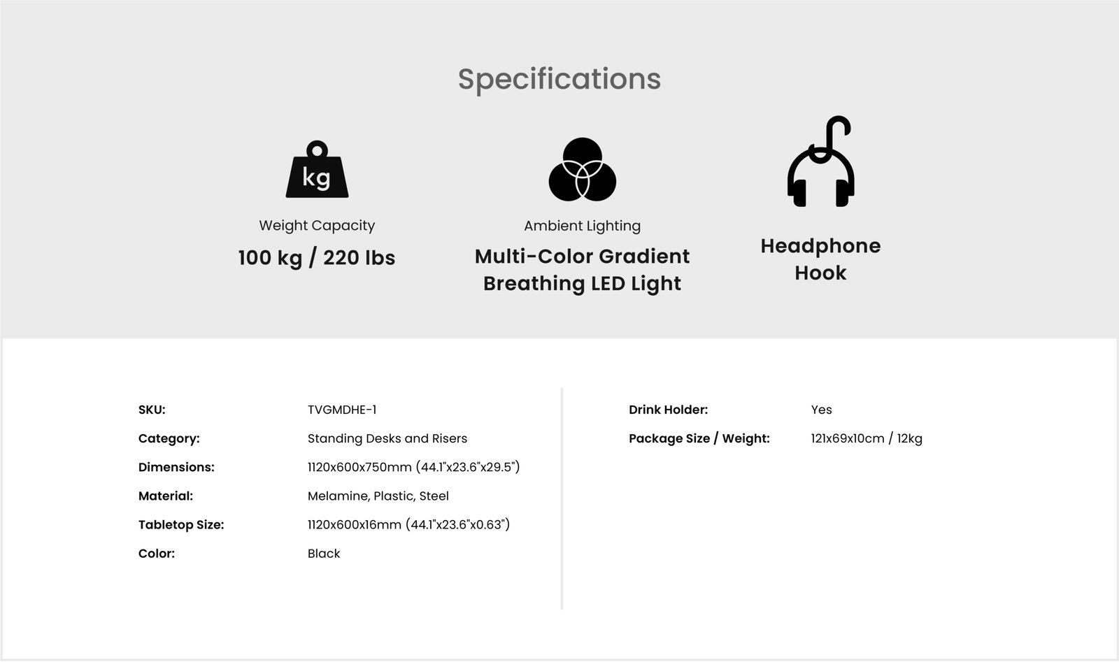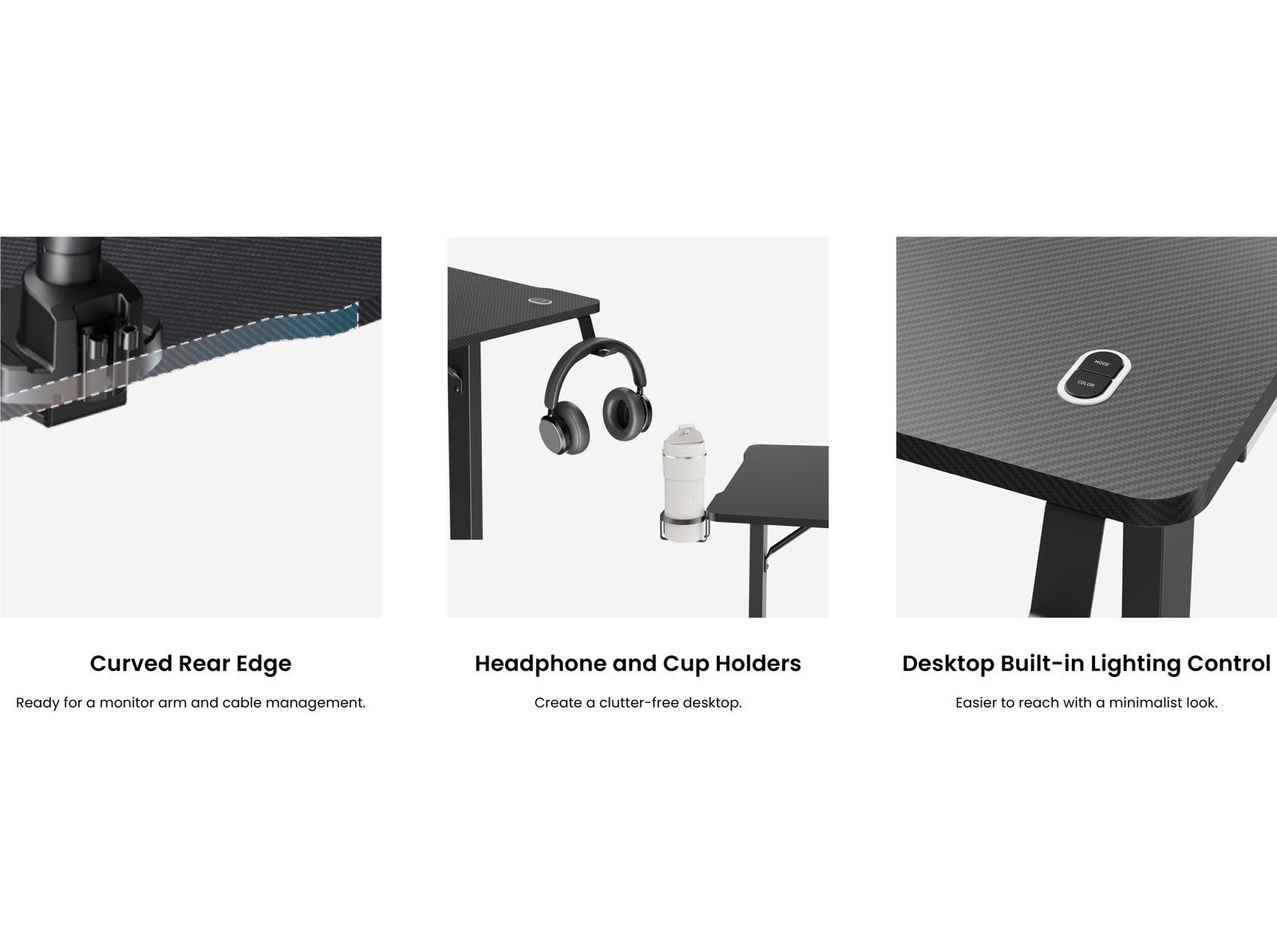 - Under-Desk headphone & cup holders create a clutter-free desktop.