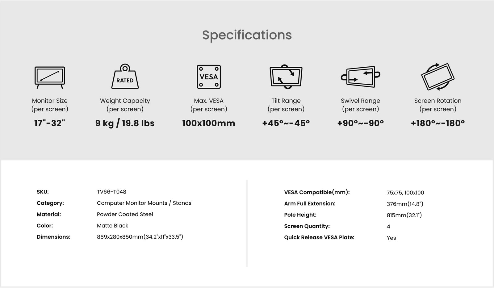 • Weight Capacity (per screen): 9kg (19.8lbs)